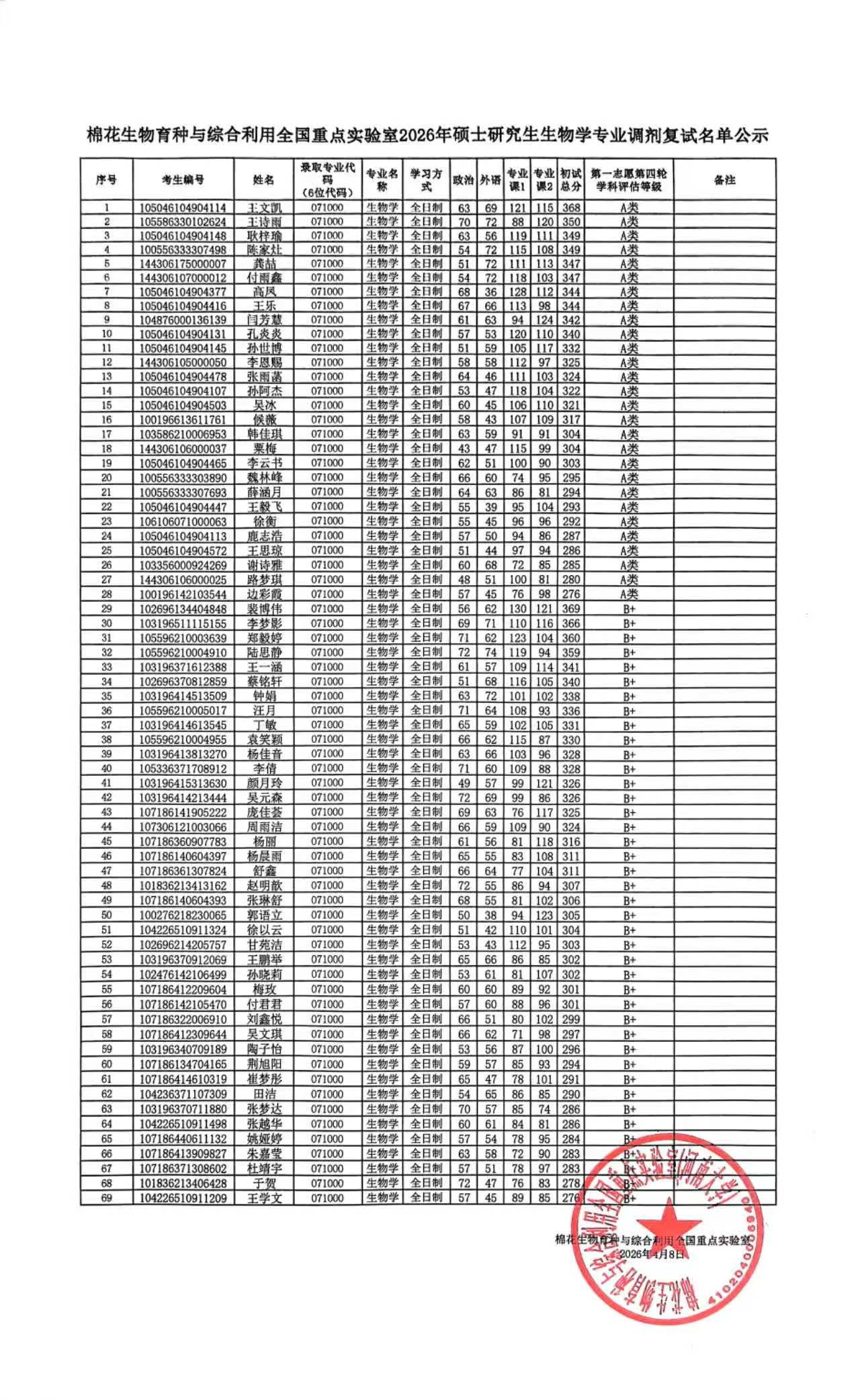 根据《河南大学省部共建作物逆境适应与改良国家重点实验室/棉花生物育种与综合利用全国重点实验室2026年硕士研究生招生调剂录取工作实施细则》,经研招网系统后台导出报名数据,按照规则产生复试名单,现将棉花生物育种与综合利用全国重点实验室2026年硕士研究生招生调剂复试名单公示如下: