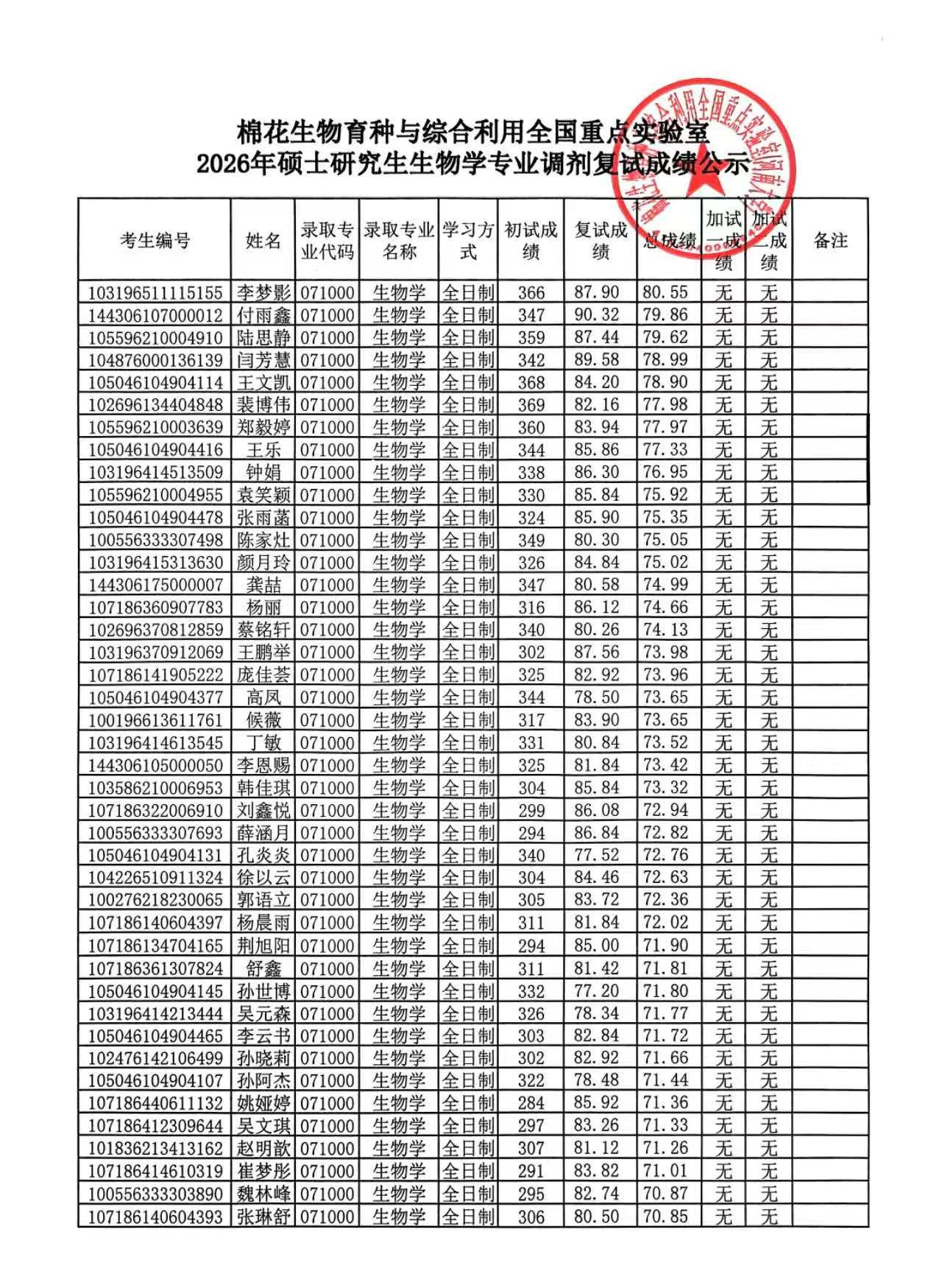 根据《河南大学省部共建作物逆境适应与改良国家重点实验室/棉花生物育种与综合利用全国重点实验室2026年硕士研究生招生复试录取工作实施细则》,现将棉花生物育种与综合利用全国重点实验室2026年硕士研究生调剂复试成绩公示如下,公示期为即日起的7个工作日,如有异议可于公示期内进行申诉。申诉情况应实事求是,以便调查审核。